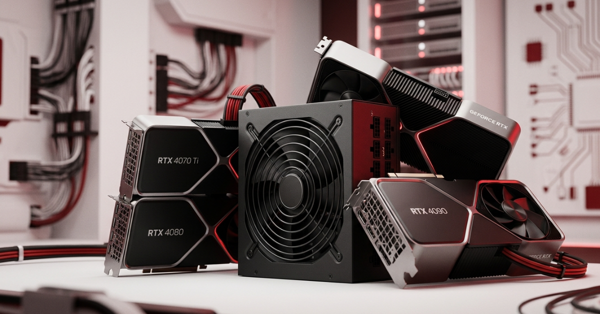 An RTX 4090 system requires at least a 1000W PSU, while 1200W is recommended for stability and future upgrades. The GPU alone can draw up to 450W, and total system power can exceed 700W during peak loads.